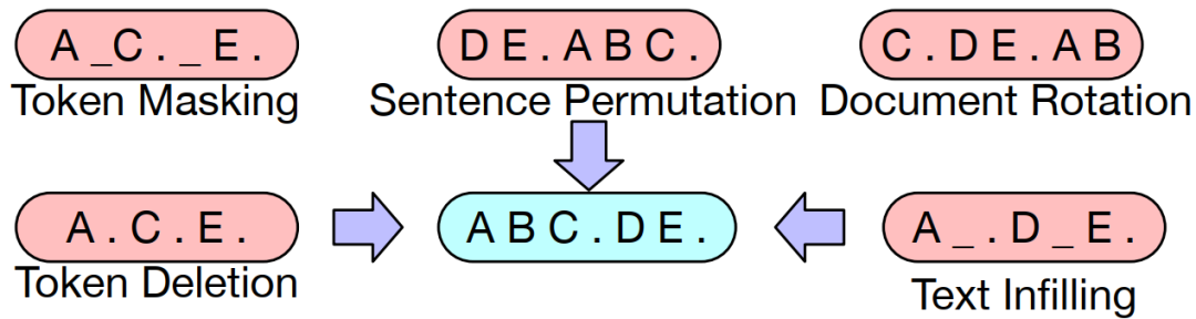 BART的损失函数是decoder的输出与原始文本之间的交叉熵。与其他去噪自编码器(一般需要定制特定的噪声方案)不同的是BART可以使用任何的加噪方式。在极端情况下,源信息可以全部缺失,此时的BART就蜕化成了一个语言模型。文章中用到的加噪方案(即原始文本如何被破坏)如Figure 2所示。