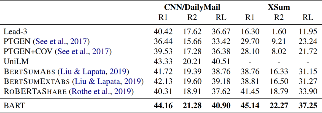Table 2:Large版模型在 SQuAD 和 GLUE 上的实验结果。BART 的效果可比肩 RoBERTa 和 XLNet,这表明 BART 的单向decoder层并不会降低模型在判别任务上的性能。