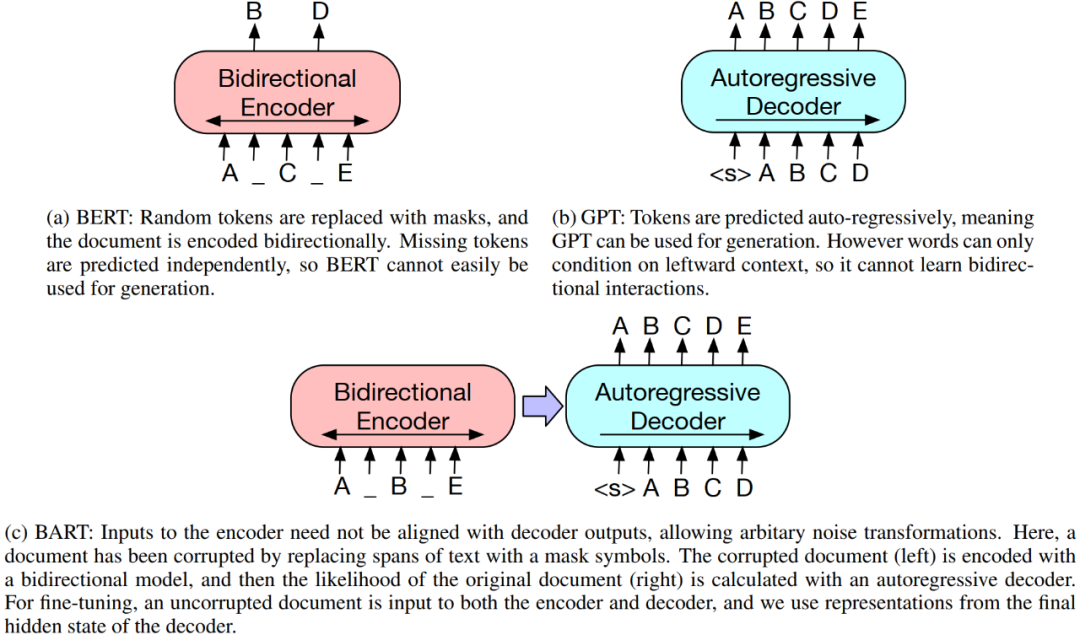 BART结合双向(比如BERT)和自回归(比如GPT) Transformer对模型进行预训练。BART还参考了GPT中的激活函数,将ReLU也改为GeLU。BART、BERT和GPT之间的对比如 Figure1所示。