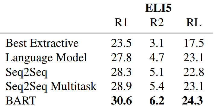 Table 6:BART在具有挑战性的ELI5长文档问答数据集上达到了最先进的结果。