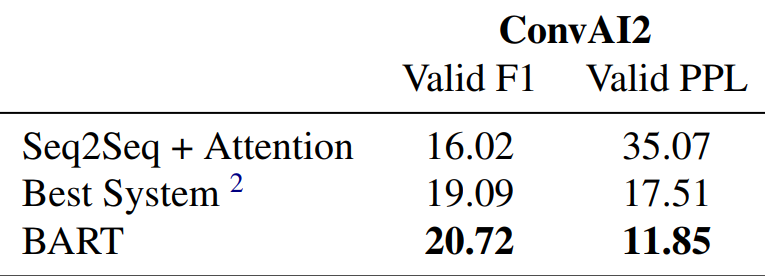 Table 5:BART 在对话生成任务上的性能优于之前的模型。其中困惑度基于 ConvAI2 官方 tokenizer 进行了重新归一化。